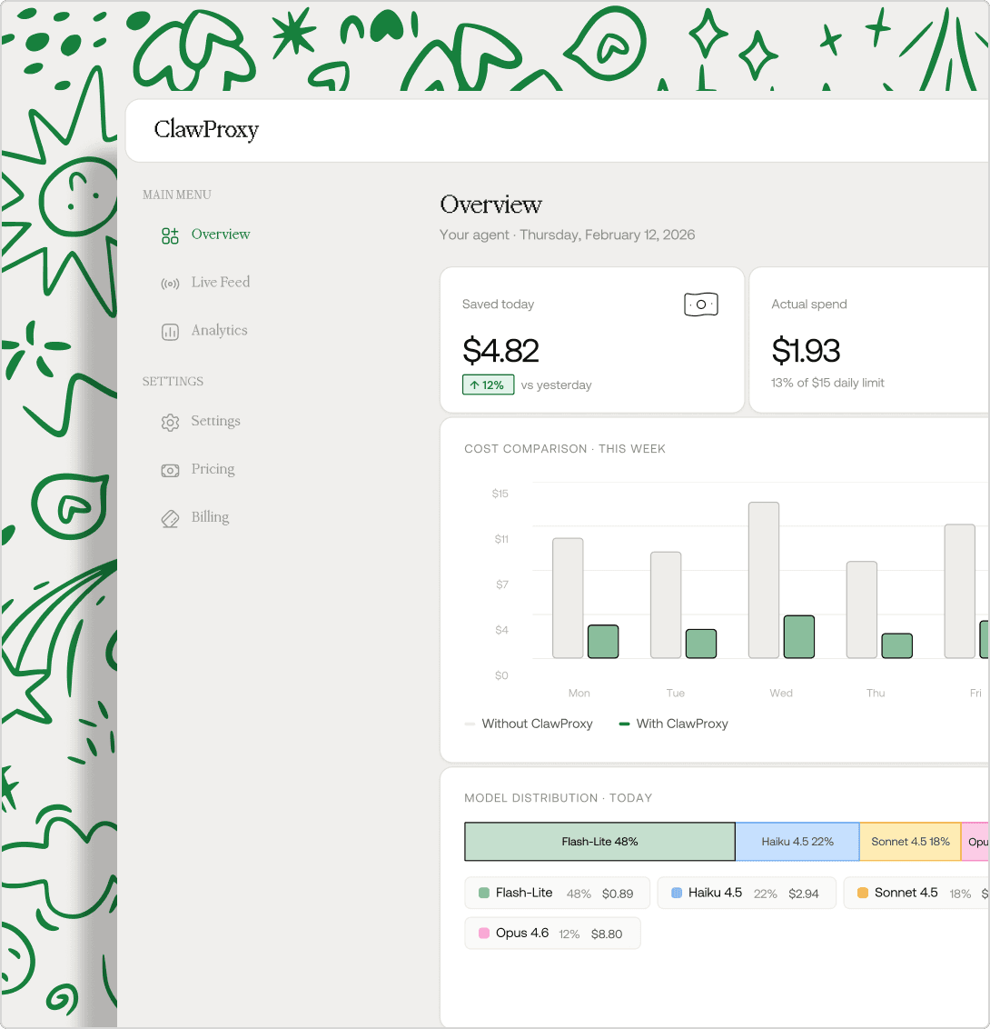 Your agents work exactly the same. ClawProxy handles routing behind the scenes. Open your dashboard to see savings in real time.